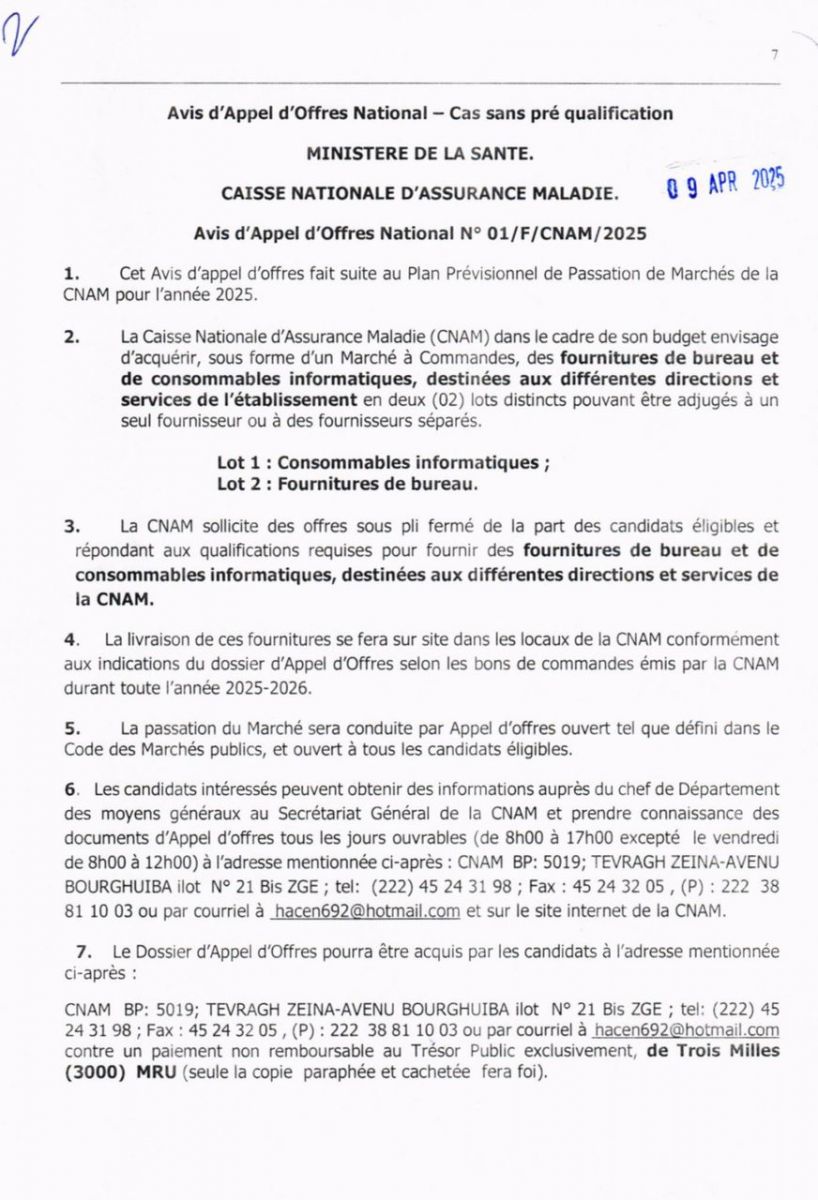 L’an deux mille vingt-cinq et le mercredi 02 avril à 10H00, la commission Ad hoc s’est réunie dans les locaux de la CNAM pour procéder à l’évaluation des offres reçues dans le cadre de la procédure d’appel à la concurrence relative à l’acquisition d’un lot de scanners au profit de la CNAM.